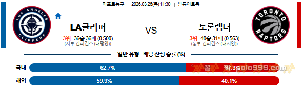 농구 분류 2026-03-26 11:30 NBA LA 클리퍼스 vs 토론토 랩터스 작성자 정보 꿀픽 작성 작성일 2026.03.25 19:44 컨텐츠 정보 140 조회 목록 답변 본문 0 추천 0 비추천 관련자료 이전 2026-03-26 10:00 NBA 유타 재즈 vs 워싱턴 위자드 작성일 2026.03.25 20:58 다음 2026-03-26 11:00 NBA 덴버 너겟츠 vs 댈러스 매버릭스 작성일 2026.03.25 19:43 댓글 0개 / 1페이지 최신순 과거순 최신순 등록된 댓글이 없습니다. 1(current) 새로운 댓글 확인 Select File Upload File 목록 답변
