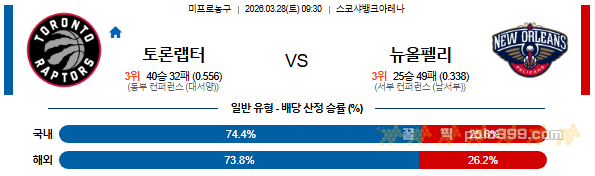 농구 분류 2026-03-28 09:30 NBA 토론토 랩터스 vs 뉴올리언스 펠린컨즈 작성자 정보 꿀픽 작성 작성일 2026.03.27 20:32 컨텐츠 정보 102 조회 목록 답변 게시물 옵션 글검색 본문 0 추천 0 비추천 관련자료 이전 2026-03-28 14:00 KBL 울산 현대모비스 vs 서울 SK 작성일 2026.03.27 20:32 다음 2026-03-28 10:00 NBA 덴버 너겟츠 vs 유타 재즈 작성일 2026.03.27 20:31 댓글 0개 / 1페이지 최신순 과거순 최신순 등록된 댓글이 없습니다. 1(current) 새로운 댓글 확인 Select File Upload File 목록 답변 게시물 옵션 글검색