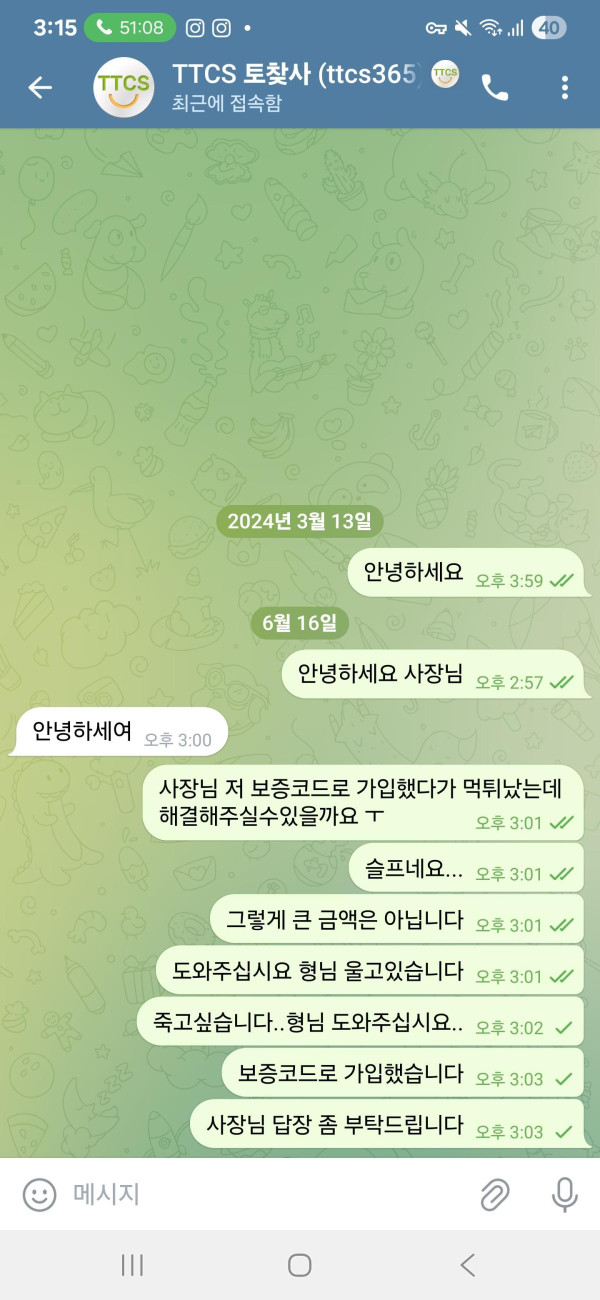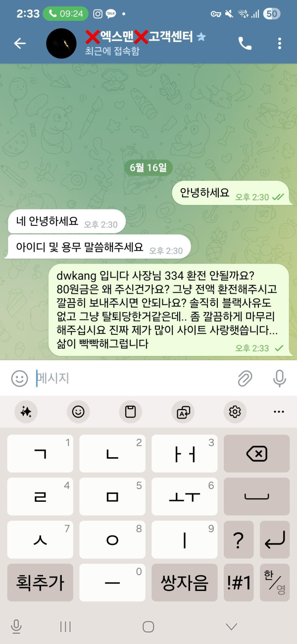 평소에 이용 잘 하고 있다가 오늘 축구로 334만원 먹고 환전 신청했는데 갑자기 원금만 돌려주고 탈퇴시키고 텔레로는 별 다른 이유 설명없이 차단만 박네요 토찾사 보증업체라면서 토찾사에서도 게시물 막고 텔레 답장도 안 하고 묵묵부답입니다 너무 화나네요