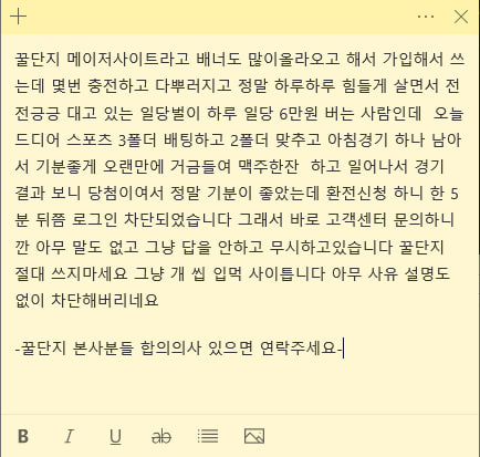 꿀단지 스포츠 3폴 203만원 먹튀 작성자 정보 졸업장인 작성 작성일 2025.06.22 11:38 컨텐츠 정보 745 조회 1 댓글 목록 답변 글쓰기 본문 사이트명 꿀단지 사이트주소 honey-51.com 피해금액 203 만원 피해내용 메이저가 아니라 구멍가게 입니다 날벼락 맞기 싫음 절대사용중지!!! 증거사진 1 추천 1 비추천 관련자료 이전 망고 (mango) 당첨금 먹튀 작성일 2025.06.23 11:06 다음 랜드(land) 먹튀 작성일 2025.06.20 12:16 댓글 1개 슬롯왕님의 댓글 슬롯왕 작성일 2025.06.22 22:43 개먹 답글 개먹 Select File Upload File 목록 답변 글쓰기 아이디 필수 비밀번호 필수 로그인 자동로그인 회원가입 정보찾기 공지 럭키라운지 공식 배너 안내 [럭키라운지 공식공지] 통협팀 관련 주의사항 안내 럭키라운지 온라인 먹튀검증 커뮤니티 꽁머니교환 지급보류 등 안내사항 [필독] 2025년 럭키라운지 보증업체 제휴종료 리스트 럭키라운지 이벤트 등록일 25.10.11 이벤트연속 출석 이벤트 등록일 25.07.28 이벤트럭키라운지 지인추천 이벤트 등록일 25.07.28 이벤트기프티콘 교환 등록일 25.07.16 이벤트먹튀사이트 제보시 15,000P 지급! 등록일 25.07.01 이벤트럭키 라운지 기프티콘 지급 방식 – 레벨별 정리 새 글 새 댓글 등록일 12.08 [자유게시판] 건승하세요 등록일 12.08 [출석체크] 르네셜님의 출석체크 등록일 12.07 [일반홍보] 신뢰성⭐️최저가⚡️토토솔루션가격✅ 등록일 12.07 [출석체크] 드임네님의 출석체크 등록일 12.07 [자유게시판] 건승 등록일 12.06 [일반홍보] 신뢰성⭐️최저가⚡️토토사이트제작✅ 등록일 11.27 [자유게시판] 대박 등록일 11.27 [자유게시판] 건승 등록일 11.26 [자유게시판] ㄱㅅ 등록일 11.24 [자유게시판] 건승하세요 등록일 11.22 [자유게시판] 달리져 등록일 11.22 [자유게시판] 오바 레벨 랭킹 포인트 랭킹 길대박이쪽지보내기 자기소개 아이디로 검색 전체게시물쪽지보내기 자기소개 아이디로 검색 전체게시물 0 은둥이쪽지보내기 메일보내기 자기소개 아이디로 검색 전체게시물쪽지보내기 메일보내기 자기소개 아이디로 검색 전체게시물 0 샛터짱자쪽지보내기 메일보내기 자기소개 아이디로 검색 전체게시물쪽지보내기 메일보내기 자기소개 아이디로 검색 전체게시물 0 윤원홍상쪽지보내기 메일보내기 자기소개 아이디로 검색 전체게시물쪽지보내기 메일보내기 자기소개 아이디로 검색 전체게시물 0 보임훔안쪽지보내기 메일보내기 자기소개 아이디로 검색 전체게시물쪽지보내기 메일보내기 자기소개 아이디로 검색 전체게시물 0 도현노려쪽지보내기 메일보내기 자기소개 아이디로 검색 전체게시물쪽지보내기 메일보내기 자기소개 아이디로 검색 전체게시물 0 하홍신휴쪽지보내기 메일보내기 자기소개 아이디로 검색 전체게시물쪽지보내기 메일보내기 자기소개 아이디로 검색 전체게시물 0 구련복동쪽지보내기 메일보내기 자기소개 아이디로 검색 전체게시물쪽지보내기 메일보내기 자기소개 아이디로 검색 전체게시물 0 장진배회쪽지보내기 메일보내기 자기소개 아이디로 검색 전체게시물쪽지보내기 메일보내기 자기소개 아이디로 검색 전체게시물 0 최맹숙마쪽지보내기 메일보내기 자기소개 아이디로 검색 전체게시물쪽지보내기 메일보내기 자기소개 아이디로 검색 전체게시물 0 드끈달믄쪽지보내기 메일보내기 자기소개 아이디로 검색 전체게시물쪽지보내기 메일보내기 자기소개 아이디로 검색 전체게시물 475,850 럭키라운지쪽지보내기 메일보내기 자기소개 아이디로 검색 전체게시물쪽지보내기 메일보내기 자기소개 아이디로 검색 전체게시물 419,510 사콘반쪽지보내기 메일보내기 자기소개 아이디로 검색 전체게시물쪽지보내기 메일보내기 자기소개 아이디로 검색 전체게시물 308,350 길대박이쪽지보내기 자기소개 아이디로 검색 전체게시물쪽지보내기 자기소개 아이디로 검색 전체게시물 138,413 캄비세스쪽지보내기 메일보내기 자기소개 아이디로 검색 전체게시물쪽지보내기 메일보내기 자기소개 아이디로 검색 전체게시물 98,550 샛터짱자쪽지보내기 메일보내기 자기소개 아이디로 검색 전체게시물쪽지보내기 메일보내기 자기소개 아이디로 검색 전체게시물 97,394 달주민빛쪽지보내기 메일보내기 자기소개 아이디로 검색 전체게시물쪽지보내기 메일보내기 자기소개 아이디로 검색 전체게시물 66,000 빈은춘진쪽지보내기 메일보내기 자기소개 아이디로 검색 전체게시물쪽지보내기 메일보내기 자기소개 아이디로 검색 전체게시물 51,000 티비조쪽지보내기 메일보내기 자기소개 아이디로 검색 전체게시물쪽지보내기 메일보내기 자기소개 아이디로 검색 전체게시물 38,052 성백유양쪽지보내기 메일보내기 자기소개 아이디로 검색 전체게시물쪽지보내기 메일보내기 자기소개 아이디로 검색 전체게시물 37,000