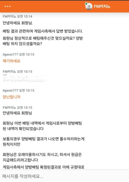 말도 안된다고 양방 배팅 아니라는 배팅한 증거를 보여주니 게임사에서 증거를 보내준거라