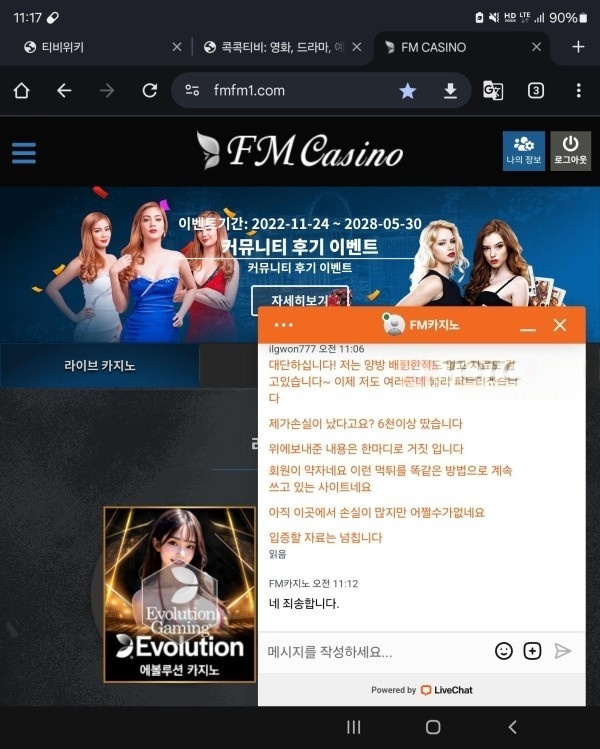 700만원 충전해서 롤링 4000%배팅 하고 7500만원 환전 신청했는데 게임사 시스템 배팅 제보로 출금이 안된다고 해서 4일 기다렸는데 어제 에볼루션 게임사에서 양방으로 배팅했다고 증거로 종이 하나 보여주는겁니다