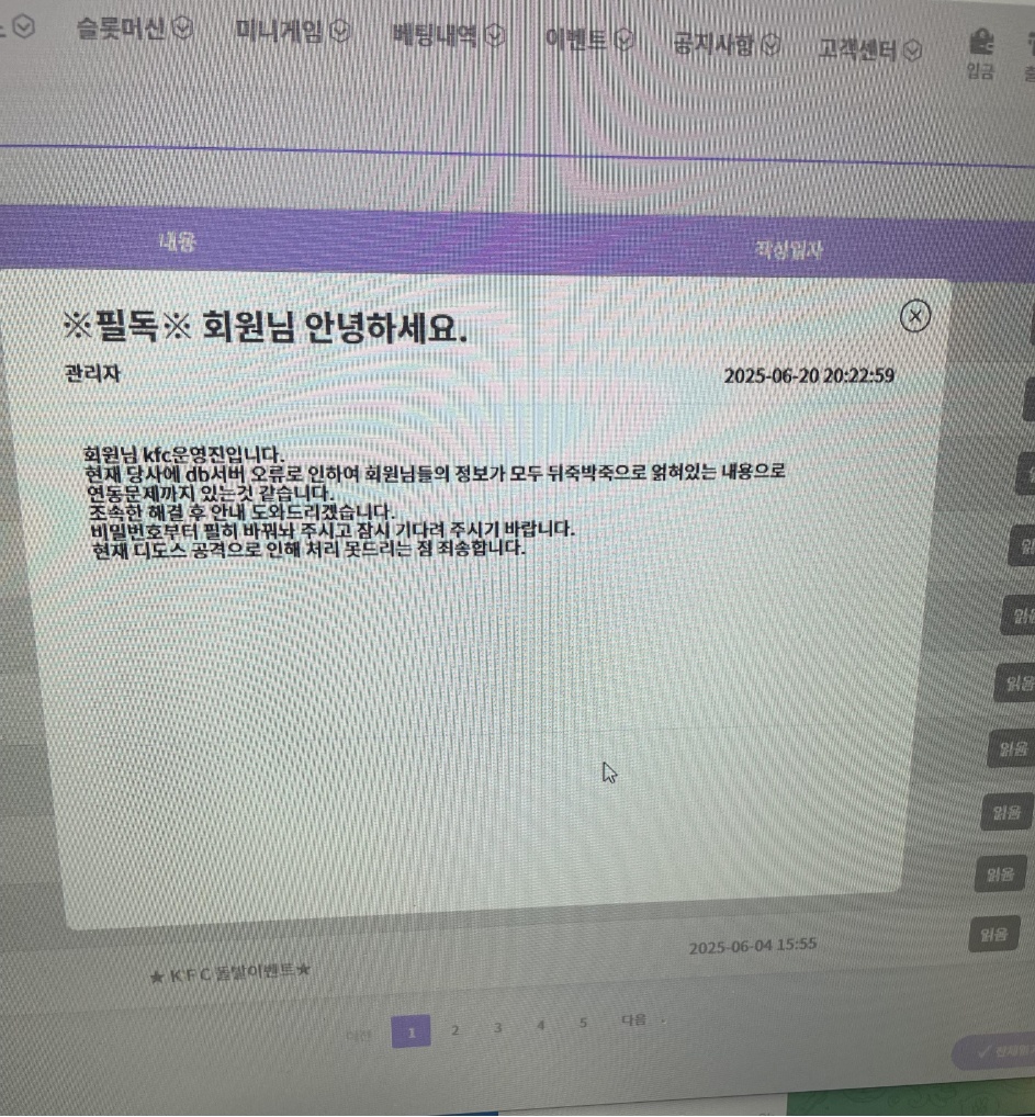 사이트에 접속하려는데, 갑자기 아이디와 비밀번호가 맞지 않아 접속 불가 상태가 됐습니다. 그 후 한참 시간이 흐르고, 사이트에서 서버 공격을 받았다고 하면서 회원 정보가 섞였다고 문자가 왔습니다. 그런데 제가 아는 동생의 아이디로는 접속이 되더군요. 참고로 그 동생은 아예 토토를 접은 사람이라 사이트를 사용하지 않아서 계정이 살아있던 상태였습니다.