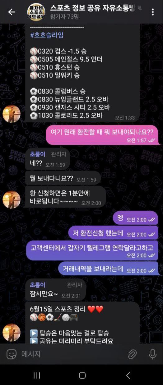 꿀벳 소액도 먹튀합니다 총 충전금액 75이고 6일이용 유튜브 스포츠분석왕자네 보고 가입했고 홍제용 계좌로 4번입금 손욱계좌로30입금 80당첨후 환전신청 하니 취소시켜 텔레연락달라고하고 통장거래내역 보내라해서 보내주니 작업배팅했다고 원금까지 몰수하고 탈퇴처리한다고합니다 ㅋㅋ 저금액으로 작업배팅하는사람이 잇음? 6일동안 5만원 득냇다고 작업배팅이라고 그머리로 작업배팅하니 티낫다고 나쁜머리로 작업배팅 하지말라고합니다 ㅋㅋㅋ 고래라는 총판새끼한테 말하니 운영자랑 말투 협박 똑같이함 운영지 새끼가 총판행세 하는거 같음 가족방에서 말하니 바로 강퇴시키고 차단박힘 통하지도 않을 협박합니다 들어보니 먹튀한 80만원으로 왕자네스포츠 텔레가족방에 커피 쐇다고 하던데 ㅋㅋㅋ 끝까지 올린다 거지새기들아 내돈 먹튀해서 가족방에 커피쏘냐?