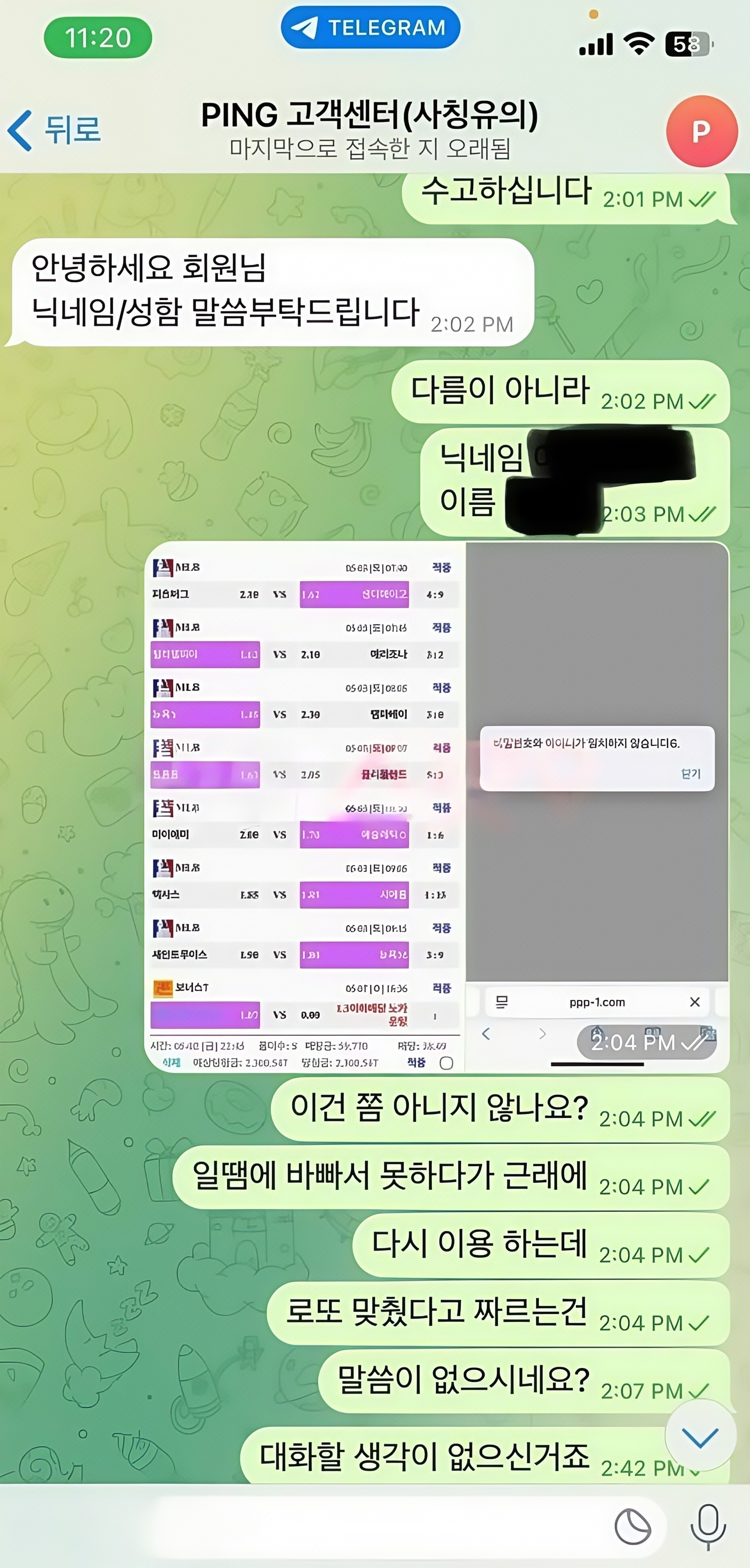핑 230만원 아무런 말도 없이 가로챕니다. 자기들도 이유 없이 먹튀 하는 게 쪽팔렸는지 단 한마디의 대답도 안 하고 있네요. 원래 소액으로 꾸준하게 이용했던 곳이었는데 요새는 바쁜 일이 생겨서 배팅을 멀리하게 되었습니다. 그러다가 이번에 시간적 여유가 생겨 MLB 7폴더를 고생해 가며 분석 후 6만원으로 로또 배팅을 걸어 놓고 잠들었는데요. 아침에 일어나서 결과를 확인해 보니까 당첨이 되어있더라고요. 6만원으로 무려 230만원을 만들었다는 쾌감에 신나는 마음으로 전액 환전을 요청했는데 갑자기 사이트에서 로그아웃됩니다. 원래도 이런 현상이 자주 일어나던 곳이라서 다시 덤덤하게 로그인을 시도했는데 아이디와 비밀번호가 일치하지 않는다는 문구가 계속 뜨네요. 그제야 저는 제가 이놈들한테 당했다는 현실을 알아차렸습니다. 7폴더 맞춘 금액을 내주기에는 배가 아주 아팠을 거 압니다. 하지만 제가 규정을 위반한 것도 아닐뿐더러 꾸준하게 잃어주면서 사용해 줬는데 이렇게 말 한마디 없이 먹튀 하는 건 예의가 아니죠. 딴 돈에 일부라도 받아보려고 텔레그램 메시지를 보내봤지만 전혀 대화할 생각이 없어 보입니다. 아이디와 닉네임을 확인하더니 답장조차 안 해주네요. 그냥 공짜로 얻어걸린 것도 아니고 눈알 빠지도록 분석해서 힘들게 만든 돈입니다. 제가 그냥 넘어갈 거로 생각했으면 오산이네요. 돈 받아 낼 때까지 글 뿌리고 다닐 겁니다.